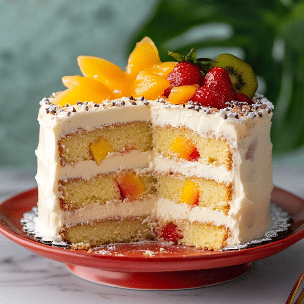 Tropical fruits like pineapple, mango, coconut, passion fruit, and lime bring bright, fresh flavors that balance the sweetness of cake beautifully. These fruits evoke sunny beaches and warm breezes, making the cake not just a dessert but a mini-vacation for your palate. Combining these flavors in a layered cake format makes for a visually stunning and delicious dessert that suits many occasions.